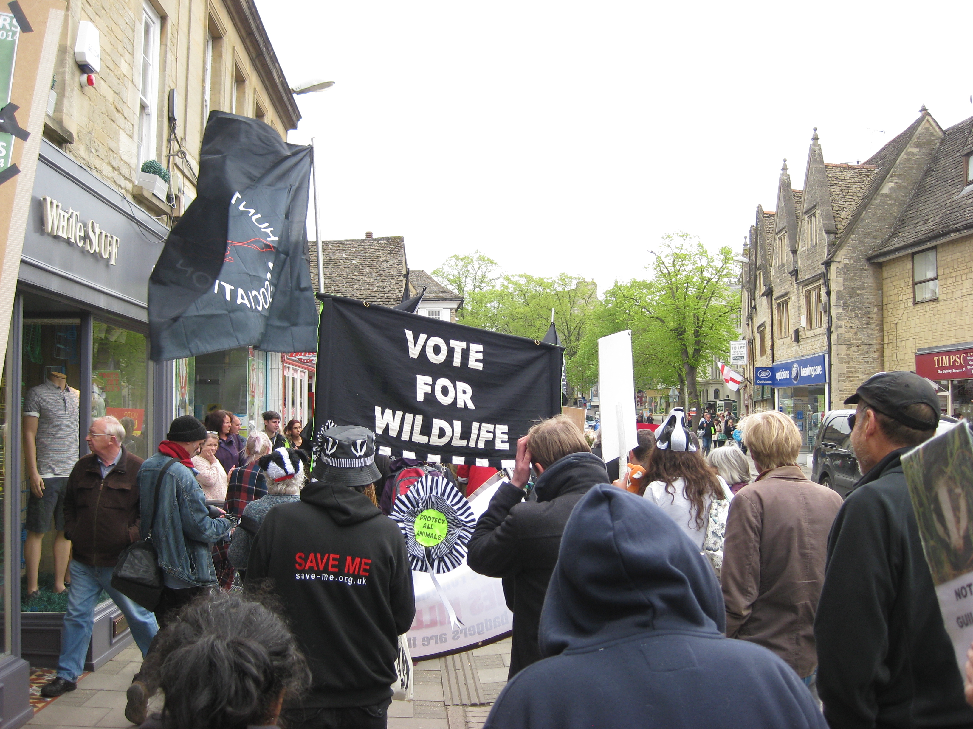 After we’d made our way through the town we ended up on Witney Green where we gathered round and listened to the speakers. First to talk was Lynn Sawyer. She spoke last week in Worcester and as I mentioned then she’s done some fantastic work. She spoke about the badger cull and how we should be looking out for setts, no matter what happens on Thursday, hunt monitors, the Heythrop Hunt and their disgusting ongoings, setts being badly affected by hunts, strengthening the hunting act and much more. After Lynn’s talk, the Green Party and Labour Party representatives spoke about their polices linking to animal welfare and the cull. It was quite funny as these were all great representatives and it shows that even in a Tory strong hold like Witney, Cameron has parties fighting against him.