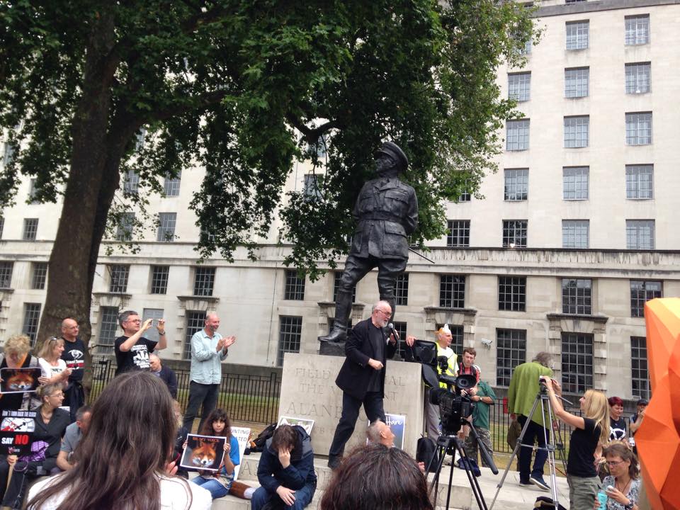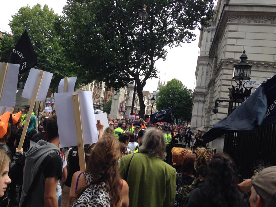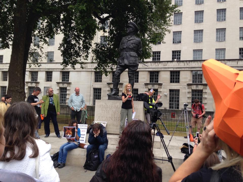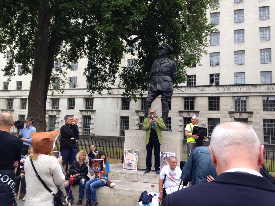 Yesterday, at 12.30pm everyone began to gather at Richmond Terrace which is opposite Downing Street. By 1pm there was a good crowd and the speeches began. Everyone who was there looked great, they either had banners, posters, placards or they were dressed up, wearing hats or had fox masks and overall looked the part. We made a great impression as lots of people walked past. We were also joined by one delightful (sarcasm) man who was a master of a few different hunts and showed no shame whatsoever.