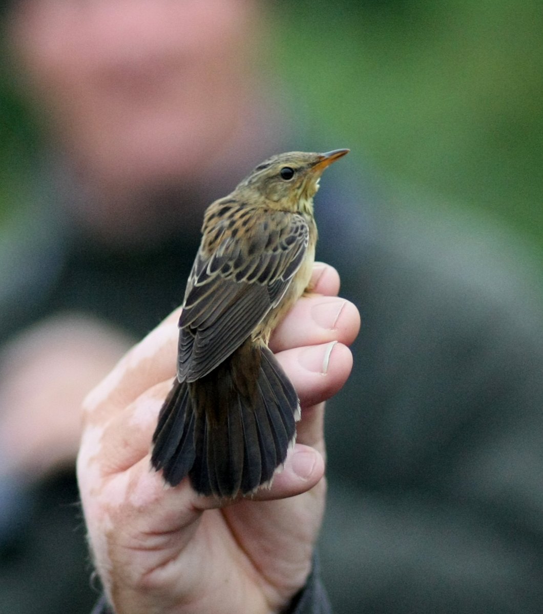 Well, I was just brewing up some tea when the radio announced that a Grasshopper Warbler had been caught in Church Field (an area owned by the Spurn Bird Observatory) and was about to be rung if anyone was interested. I haven’t seen one this year so headed on my way up to where it had been caught in the ringing trap there. But by the time I got there, there was some debate between birders whether it was a Common Grasshopper Warbler. As when the bird was first taken out of the trap its feathers were wet therefore the pattern and colouration of them was difficult to notice and it was thought to be a Gropper. However when measuring began, alarm bells rung as features such as the wing length were too long and as the birds feathers dried, white fringing to the tertials and tail feathers became visible. It was a PG Tips.